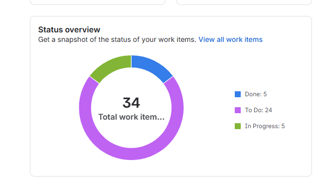See pilted näitab Jira projekti ülevaadet. Ülemises osas on diagramm, mis kuvab ülesannete staatust (tehtud, tegemisel, tegemata).