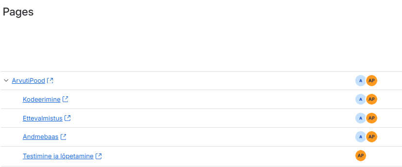 See pilt näitab projekti lehekülgi (Pages). Siin on erinevad alamlehed, nagu kodeerimine, ettevalmistus, andmebaas ja testimine.