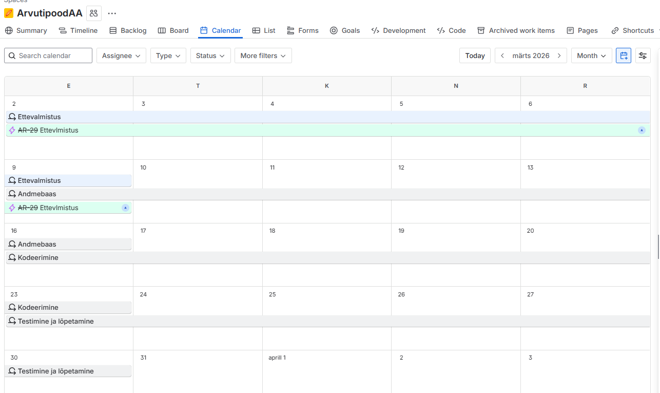 See pilt näitab projekti ajakava (Timeline). Kuvatud on erinevad etapid: ettevalmistus, andmebaas, kodeerimine ja testimine. Iga etapp on ajaliselt planeeritud.