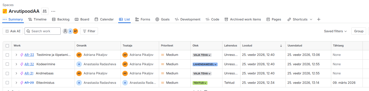 See pilted näitab Jira projekti ülevaadet. Ülemises osas on diagramm, mis kuvab ülesannete staatust (tehtud, tegemisel, tegemata).
