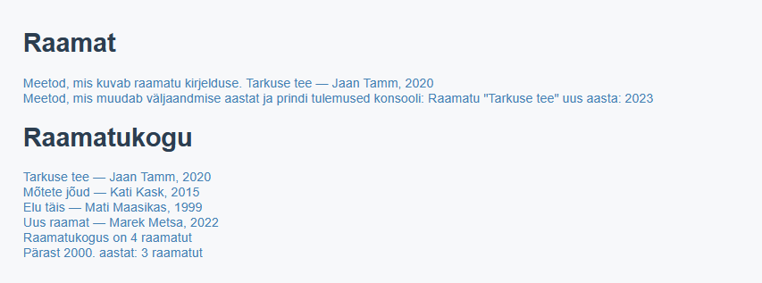 raamaton objekt, mis esindab ühte raamatut. Sellel on:pealkiri: raamatu nimi (“Tarkuse tee”),autor: raamatu autor (“Jaan Tamm”),aasta: raamatu väljaandmise aasta (2020).