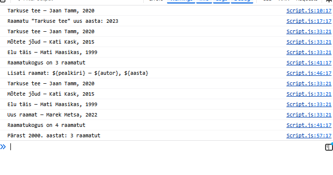 console.log("Lisati raamat: ${pealkiri} — ${autor}, ${aasta}");