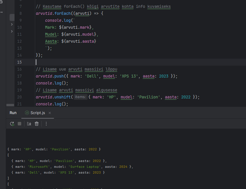 arvutid.unshift({ mark: 'HP', mudel: 'Pavilion', aasta: 2022 });