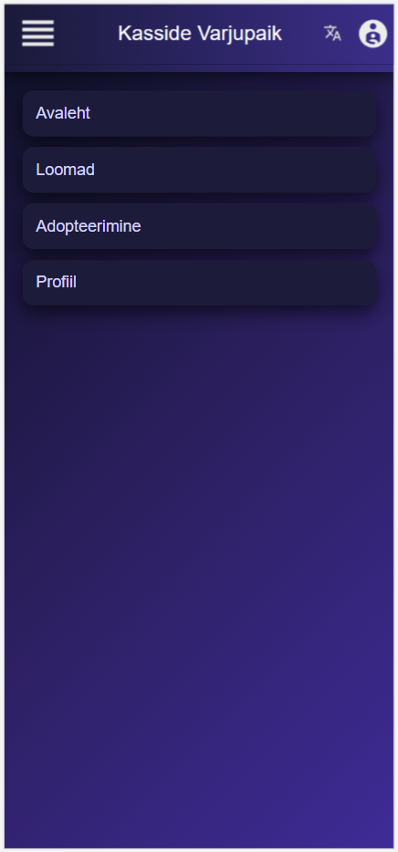 Sellel ekraanil kuvatakse rakenduse peamenüü. Üleval on rakenduse nimi “Kasside Varjupaik” ja navigatsiooni ikoonid. Menüüs on neli peamist valikut: Avaleht, Loomad, Adopteerimine ja Profiil. Need nupud võimaldavad kasutajal liikuda rakenduse erinevate funktsioonide vahel. Kujunduses on kasutatud tumedat sinise ja lilla värvi tausta ning ümardatud menüüelemente.