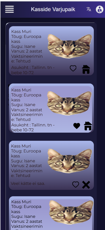 Sellel ekraanil kuvatakse varjupaigas olevate kasside nimekiri. Iga kass on esitatud eraldi kaardil, kus on näha kassi pilt, nimi, tõug, sugu, vanus, vaktsineerimise staatus ja asukoht. Kaardi juures on ka ikoonid, mis võimaldavad looma lisada lemmikute hulka või vaadata täpsemat infot adopteerimise kohta. Mõne kassi juures on märge, et loom ei ole hetkel saadaval. Kujunduses on kasutatud tumedat sinise ja lilla värvi tausta ning ümardatud kaartide kujundust.