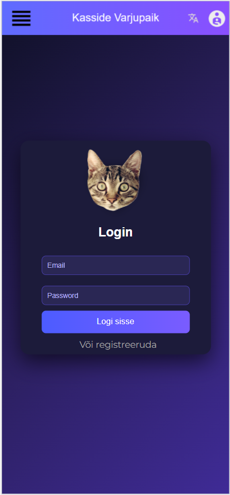 Ekraanil on mobiilirakenduse sisselogimise leht. Üleval on rakenduse nimi “Kasside Varjupaik” ja menüüikoonid. Lehe keskel asub sisselogimise vorm, millel on kassipilt, pealkiri Login, kaks sisestusvälja (Email ja Password) ning nupp Logi sisse. All on link “Või registreeruda” uue konto loomiseks. Kujunduses on kasutatud tumedat sinise ja lilla värvi gradienti.