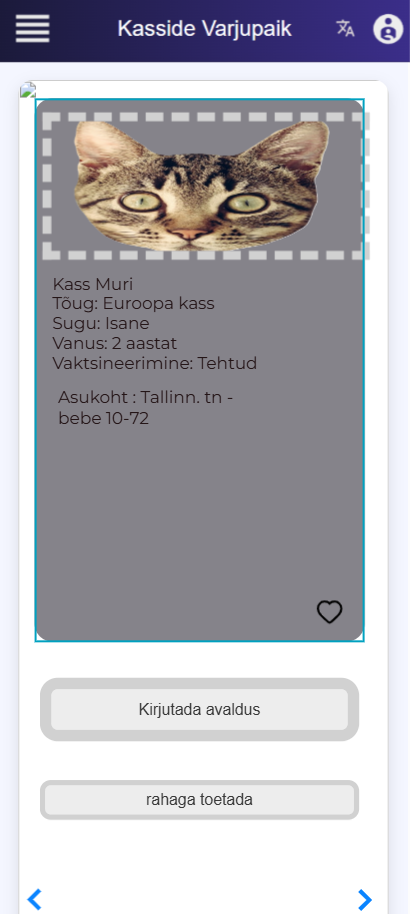Sellel ekraanil kuvatakse konkreetse kassi detailne info. Üleval on rakenduse nimi “Kasside Varjupaik” ja navigatsiooni ikoonid. Keskel on kaart kassi pildi ja põhiandmetega: nimi Muri, tõug, sugu, vanus, vaktsineerimise staatus ning asukoht. Kaardi all on kaks nuppu – “Kirjutada avaldus” adopteerimiseks ja “rahaga toetada” varjupaiga toetamiseks. Ekraanil on ka lemmiku (südame) ikoon ning navigeerimisnooled teiste loomade vaatamiseks.