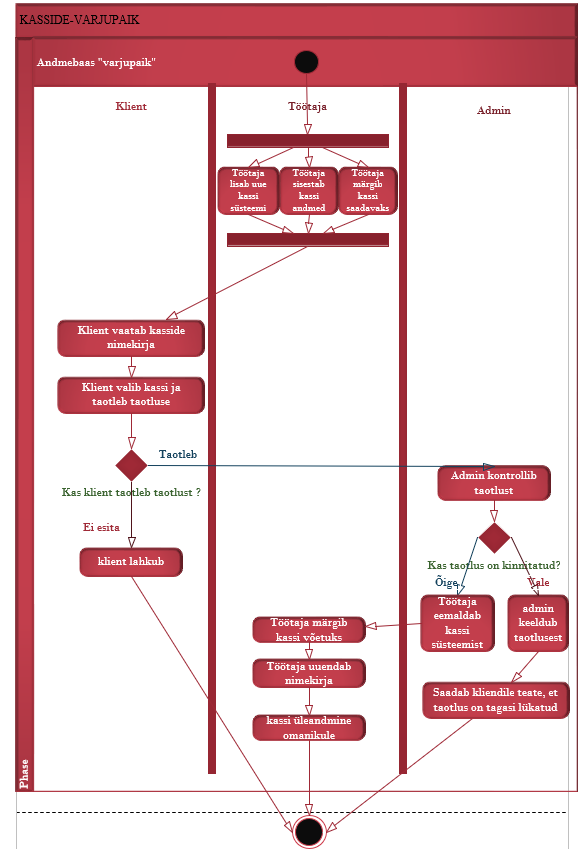 Diagramm on jagatud kolmeks osaks (swimlane):